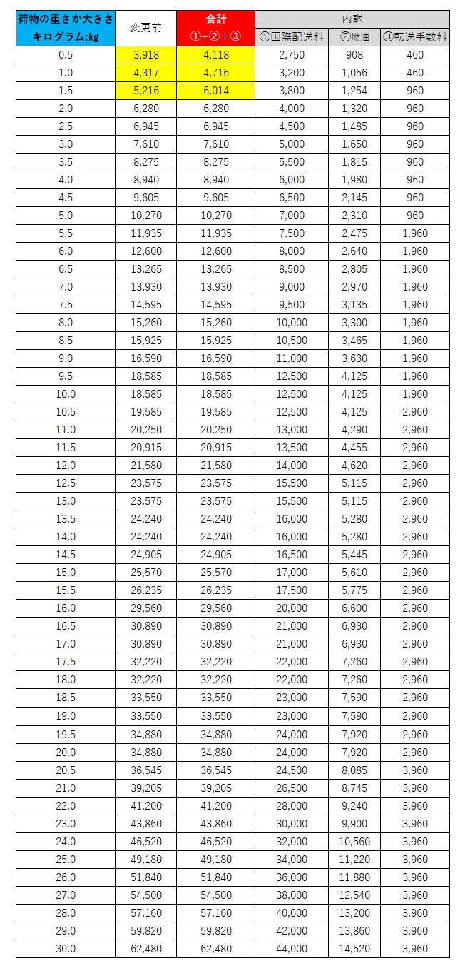 今回の料金改定はFedexで発送しているNORTH AMERICA,CENTRAL AMERICA・北米南米エリア、