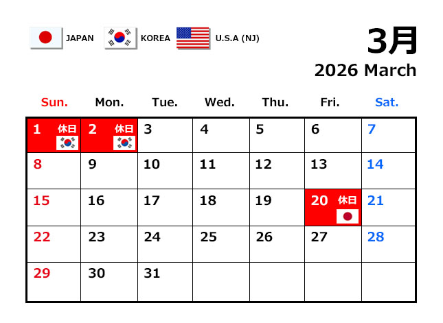 韓国 : 3月2日(月) 三一節 振替休日 (検品、入庫、集荷、出荷なし)